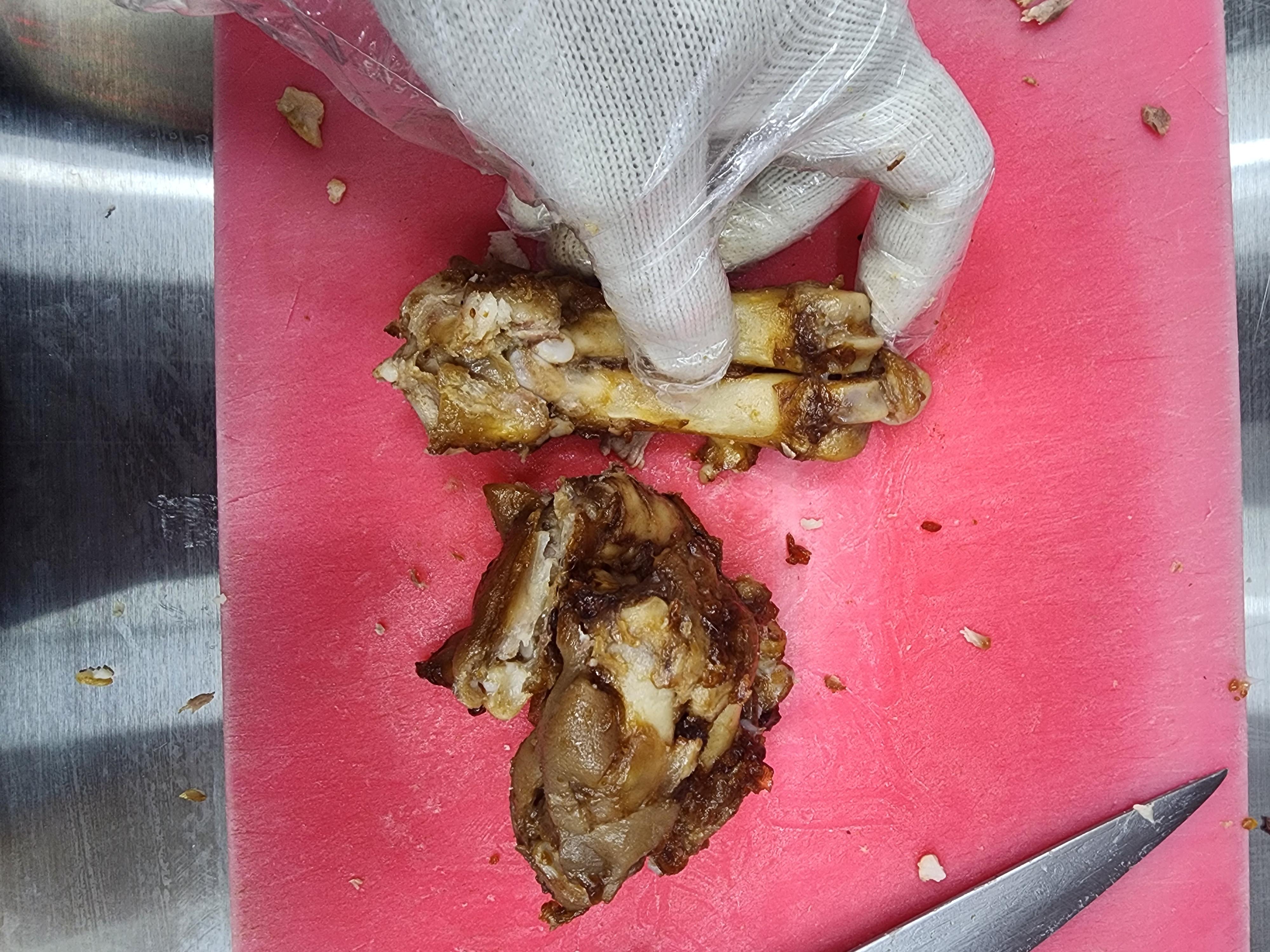그리고 칼을 뼈에다 대고 아래로 슬슬 내려주며 썰어줍니다